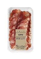 italienischer Schweinenacken*(Coppa), Meersalz, Gewürze*, Dextrose*Energie | Fett | gesättigte Fettsäuren | Kohlenhydrate | Zucker | Eiweiss | Salz |