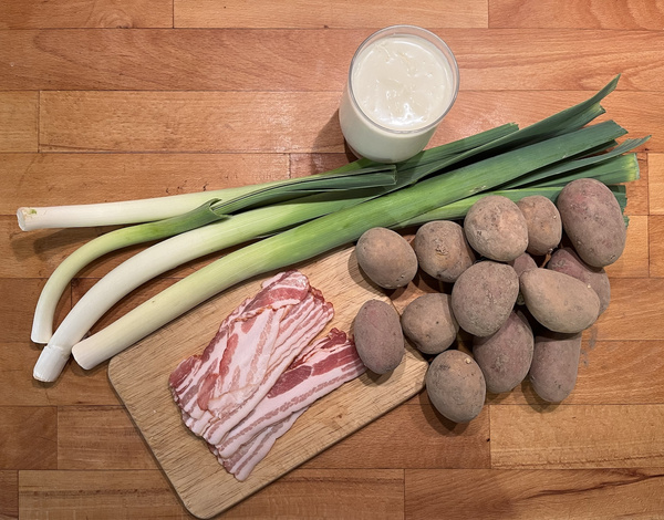 Speck in kleine Streifen schneiden und in einer Pfanne anbraten. Porree und ggf. noch etwas Öl dazugeben. Speck und Porree dürfen gern etwas Farbe bekommen.