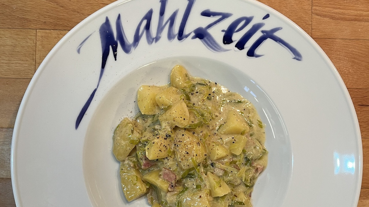 Alles mit der Sahne ablöschen und die vorgegarten Kartoffeln dazugeben. Eventuell mit etwas Wasser oder Brühe verlängern, so dass alles leicht mit Flüssigkeit bedeckt ist.