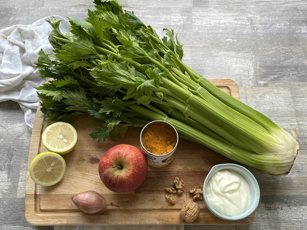 Stangensellerie waschen, unteren und oberen Teil abschneiden. Die Stangen in ganz dünne Streifen und dann in Würfel schneiden. Je feiner desto besser, denn so ist der starke Selleriegeschmack nicht so vorherrschend. Apfel waschen, entkernen und ebenfalls fein würfeln. Alles zusammen mit den gerösteten Walnusskernen vermengen.