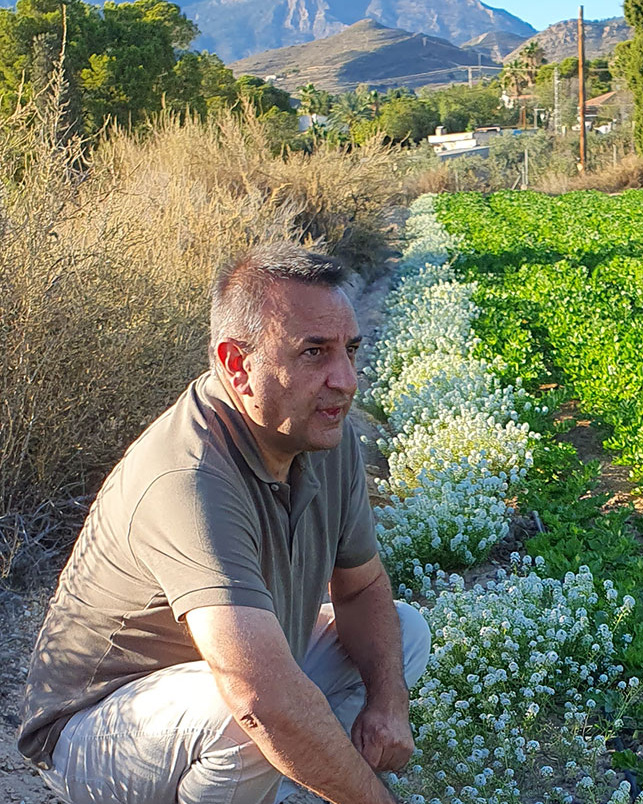 Zur Unterstützung der Befruchtung setzt Francisco Javier auf Hummeln, die in den Gewächshäusern leben. Um den Lebensraum für Nützlinge attraktiv zu machen werden Blumen gepflanzt. Das erfreut auch die Mitarbeiter und uns als Besucher.